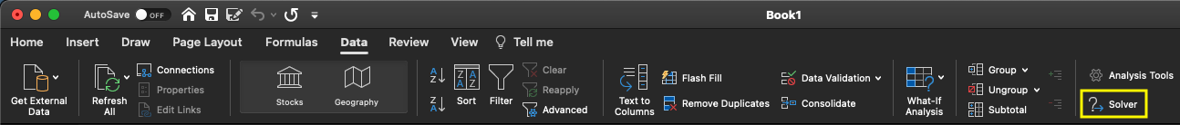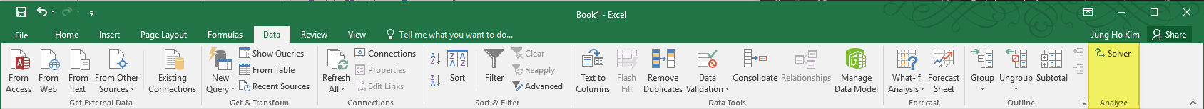 리본 메뉴의 Data 탭에가보면 Solver가 추가된 것을 확인하실 수 있습니다.