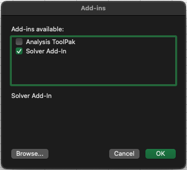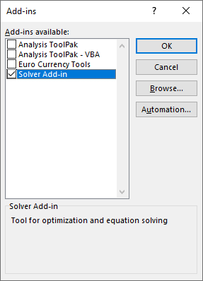 Add-ins 창이 열리면 Solver Add-in을 체크하고 OK 버튼을 누릅니다.