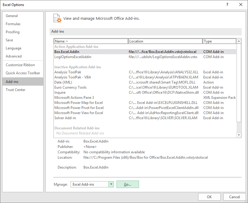 옵션창이 열리면 Add-ins로 가서, 아래쪽의 Go... 버튼을 눌러줍니다.