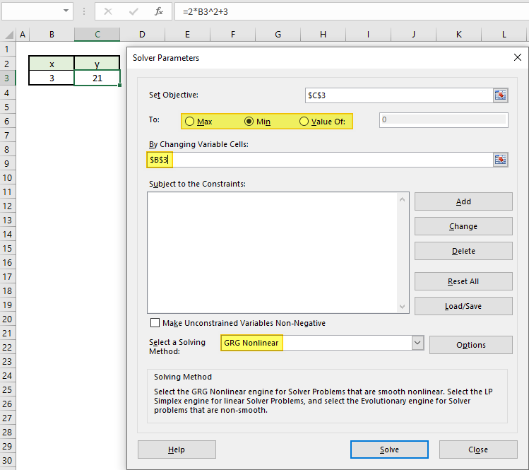 해찾기 기능을 사용하여 y = 2x² + 3의 최소값을 구해봅시다.