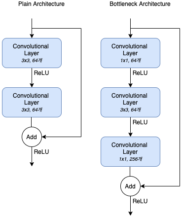 Residual Block에는 그림에서 보듯이 Plain Architecture와 Bottleneck Architecture라는 2개의 구조가 있습니다.
