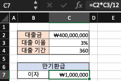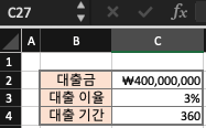 이제 대출금과 이율만 원하는대로 넣어주면 엑셀이 알아서 이자를 계산해 줍니다.