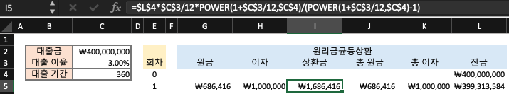 매월 같은 금액을 상환해야하므로 이 것이 매달 같도록 해줘야 합니다.