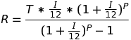 R은 상환금, T는 대출금, I는 대출 이율 즉, 12로 나누었으니 월 이율이 되는거죠. P는 대출 기간입니다.