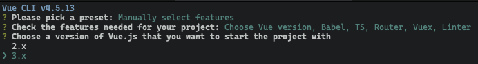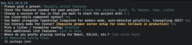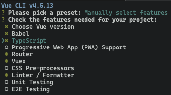 I picked TypeScript, Router, and Vuex.
