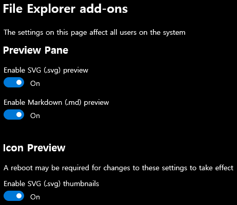 설정에서 볼 수 있듯이, SVG 파일이랑 Markdown 파일의 미리보기를 지원해요.