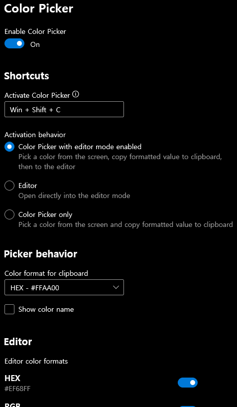 모드도 엄청 다양한데, 전 HEX랑 RGB만 사용 중이에요.