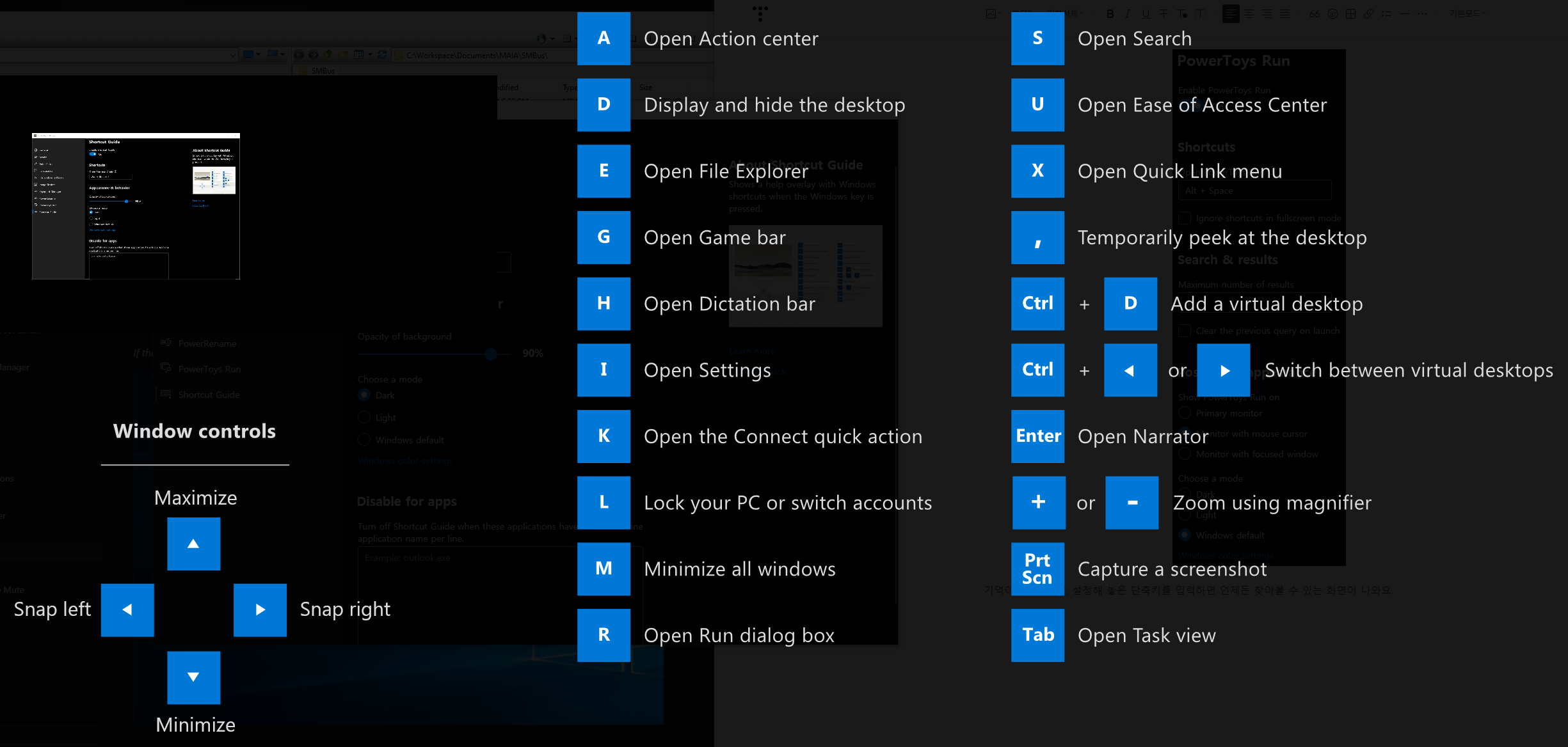 요건 윈도우즈키를 함께 눌렀을 때의 동작되는 단축키 설정을 보여줍니다.