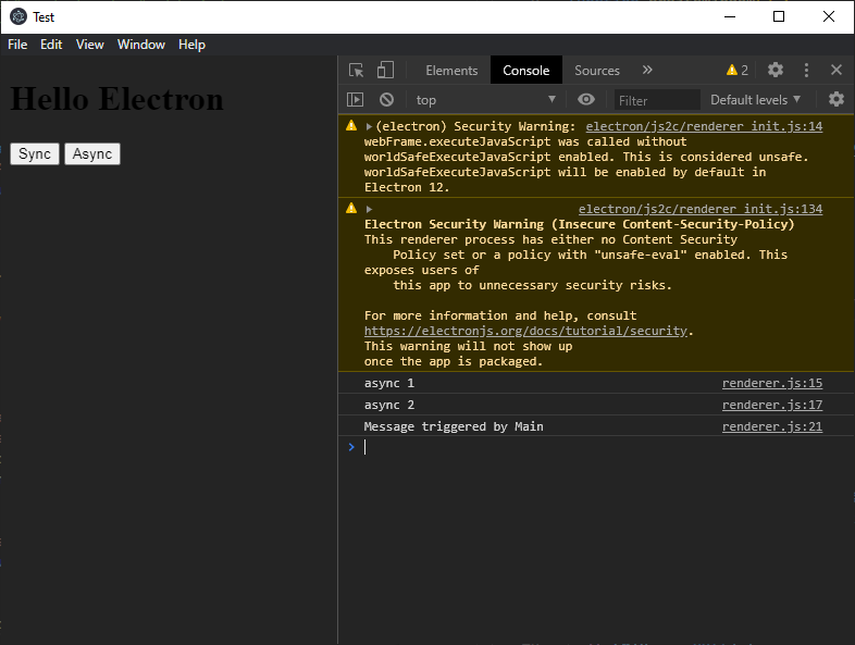 - If the renderer process received the message from the main process, the log message 'Message triggered by Main' shows up in the console.log.