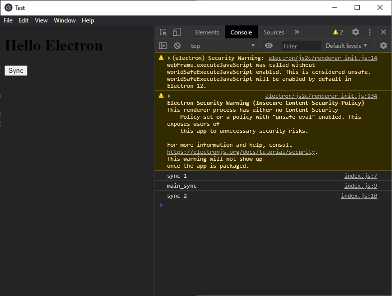 - The renderer process doesn't wait for response from the main process, so the log message 'sync 2' shows up in the console log and the function is finished.