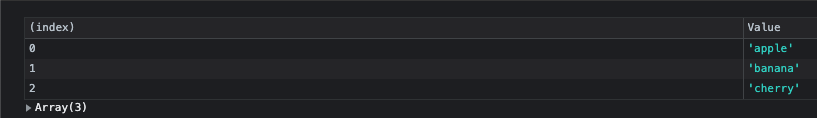 console.table(['apple', 'banana', 'cherry']);