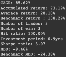우리 전략을 평가해보면 그냥 들고있던 것보다 못한 수익률을 보여줬지만, 기간 내 낙폭이 적어 좀 더 안전한 방법이었다... 할 수 있겠네요.
