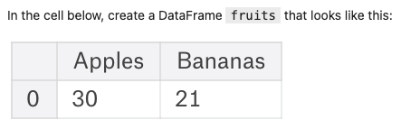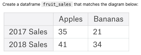 {"Apples": [35, 41], "Bananas": [21, 34]}, index=["2017 Sales", "2018 Sales"]
