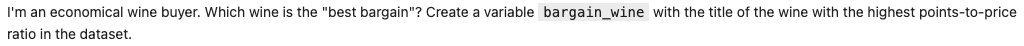 bargain_wine = reviews.loc[(reviews["points"] / reviews["price"]).idxmax(), 'title']