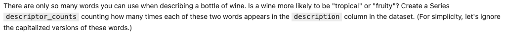 reviews["description"].map(lambda desc: "fruity" in desc).sum()