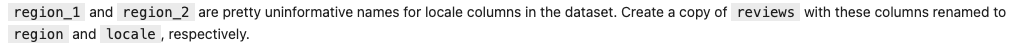 renamed = reviews.rename(columns={'region_1': 'region', 'region_2': 'locale'})