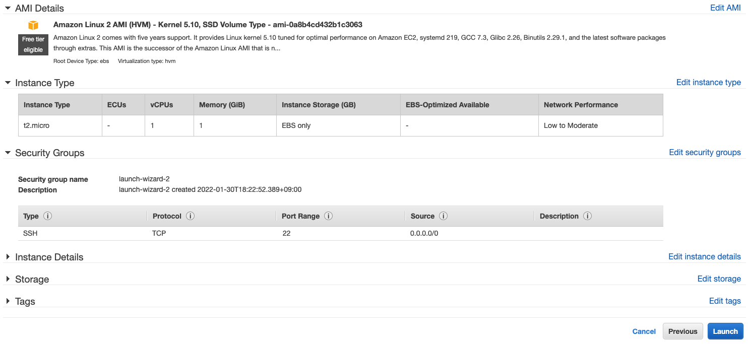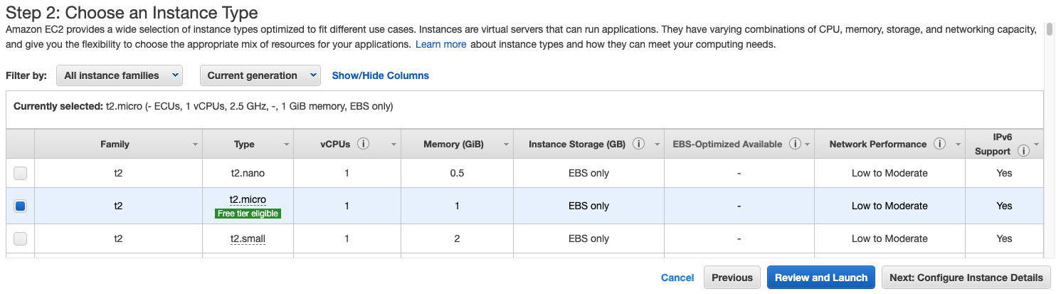 > Select instance type and click the Review and Launch button