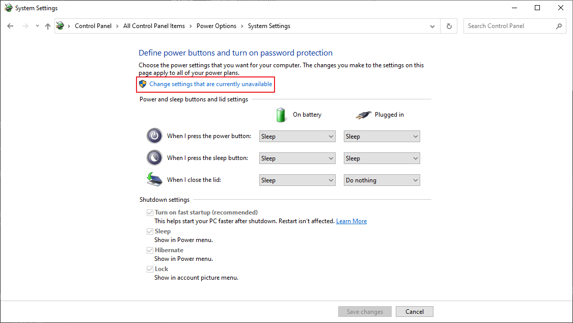 Change settings that are currently unavailable 메뉴를 선택해줍니다.