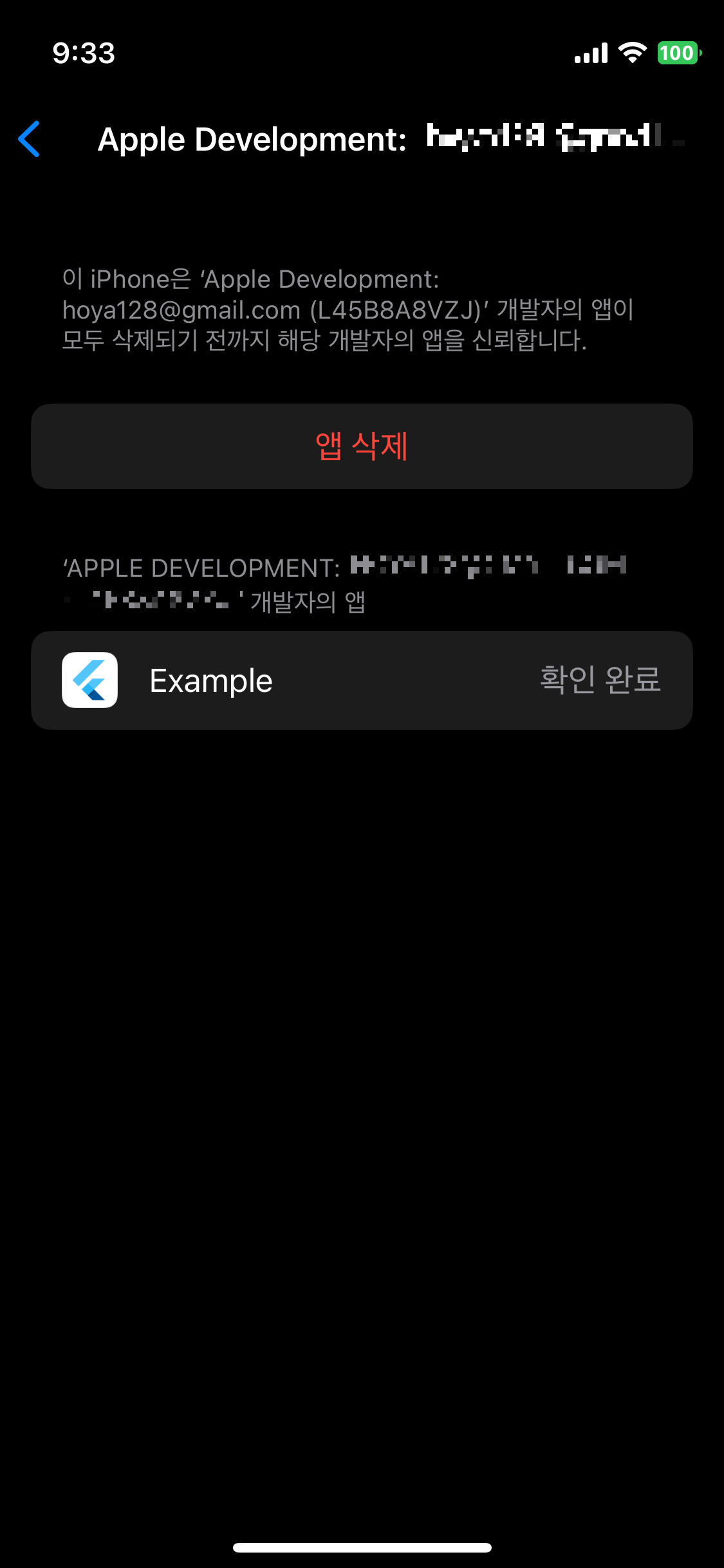 설정 > 일반 > VPN 및 기기 관리로 가셔서 개발자 앱에 있는 본인의 계정을 터치하여 신뢰하시면 됩니다.
