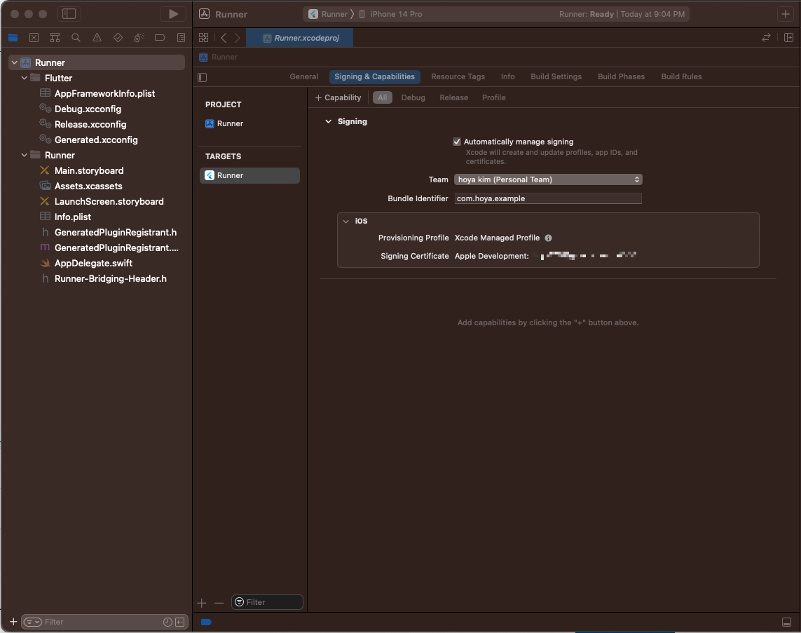 ios/Runner.xcworkspace를 xcode에서 열어줍니다.