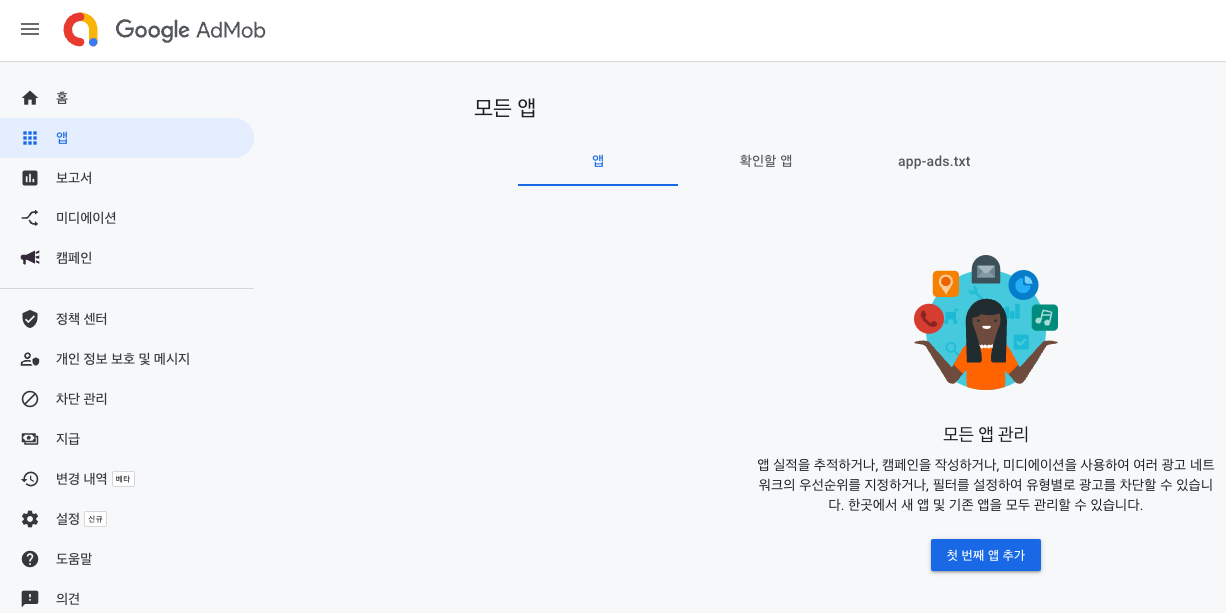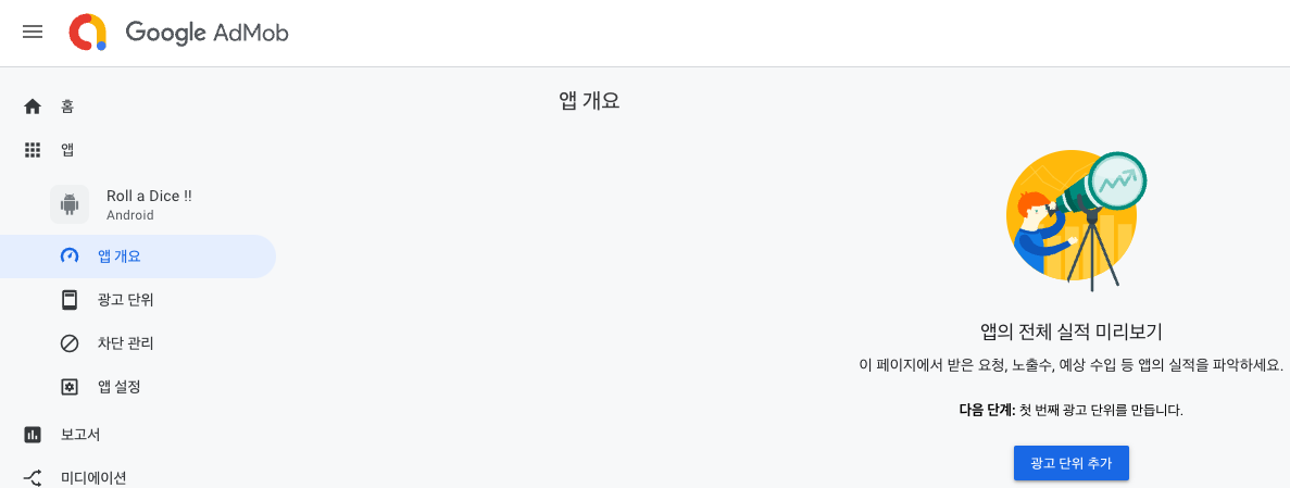 AdMob 사이트에서 등록한 앱의 앱 개요로 갑니다.