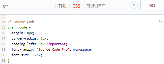 코드가 왼쪽에 너무 치우쳐 있는 것도 보기 싫어서 패딩으로 띄워 주었는데, 이 때 !important가 정말정말 중요합니다.