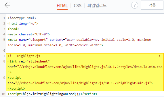 헤드 태그안에 highlight의 cdn 링크를 넣어주고, 적용을 합니다.