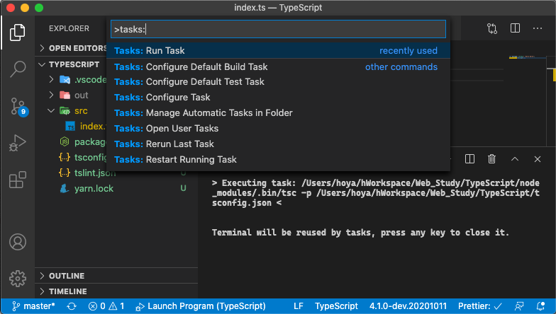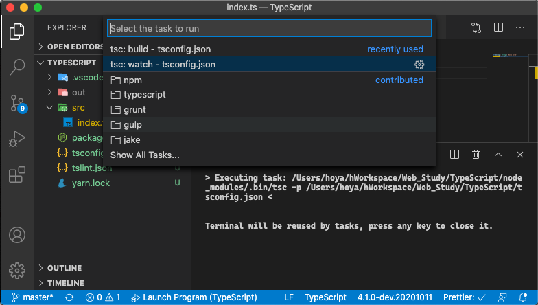 I created two tasks, one is for a one-time building, and the other is watching mode building.