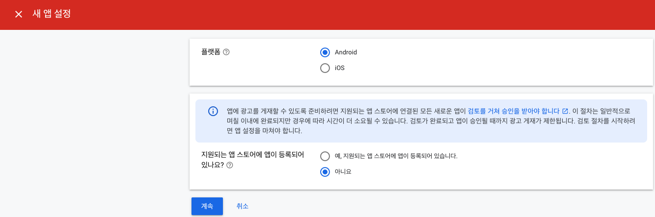 일단 Android로 선택을 하고, 아직 등록되지 않은 앱이라고 가정할게요.